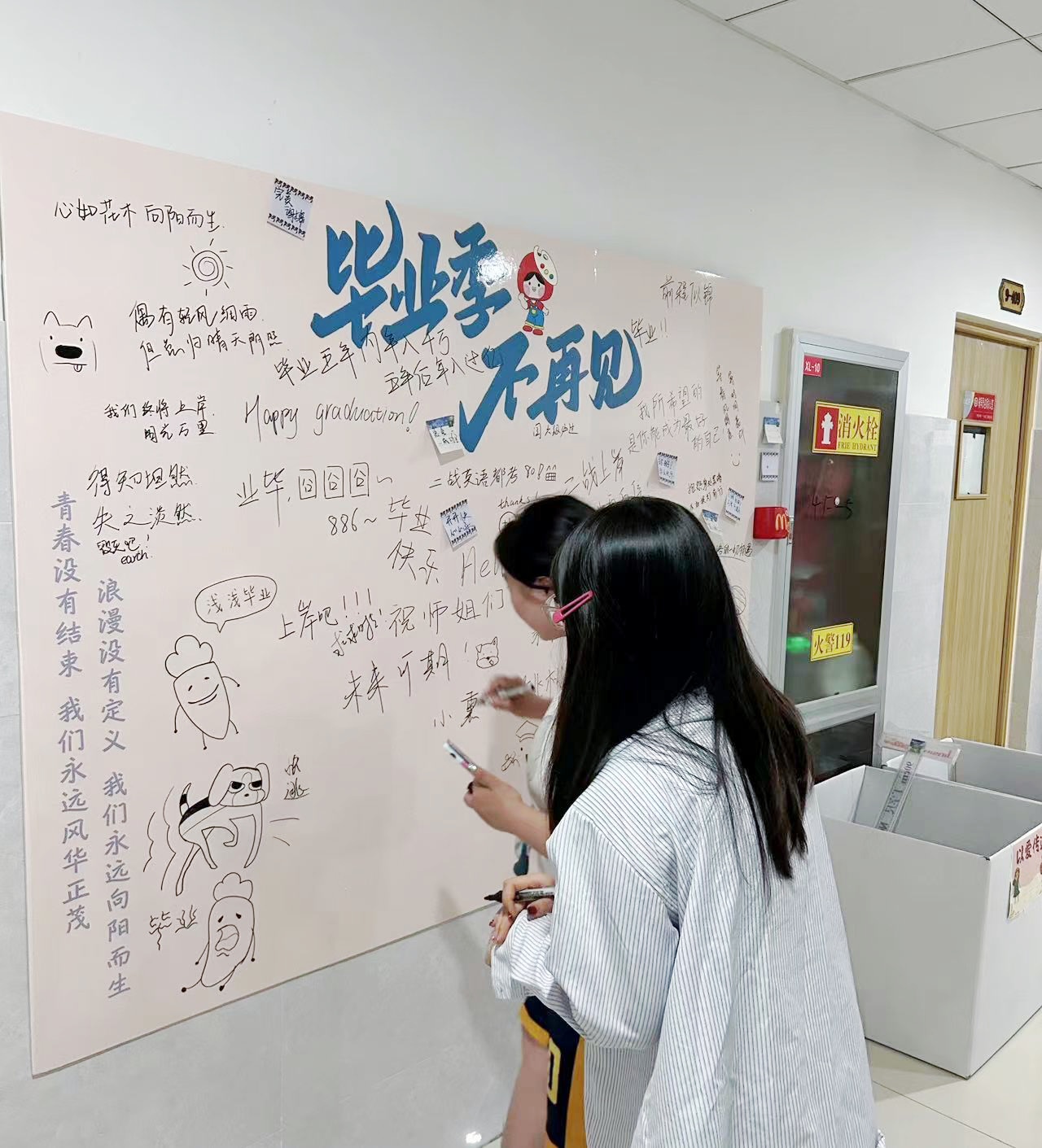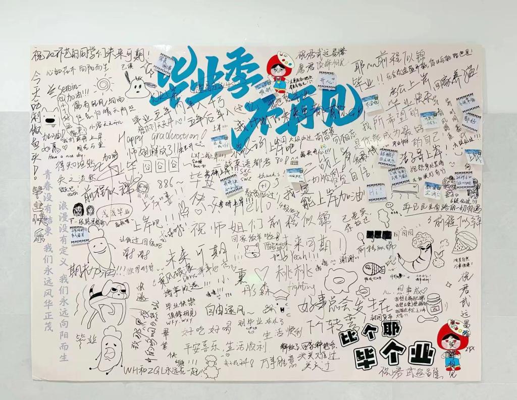 毕业生们到捐赠点踊跃捐献自己闲置物品,主要包括书籍、生活用品、文具和绘画作品等。志愿者们分工明确,各司其职,对物品收集箱的物品进行分类整理,将整理好的捐赠物品进行登记。志愿者们将捐赠物品进行展示,无偿供其他在校生领取并登记。毕业生在留言kt版上记录下了对母校的感激、对未来的憧憬和对青春的怀念,每一句留言都简短而深刻,凝聚着毕业生们的真挚情感。