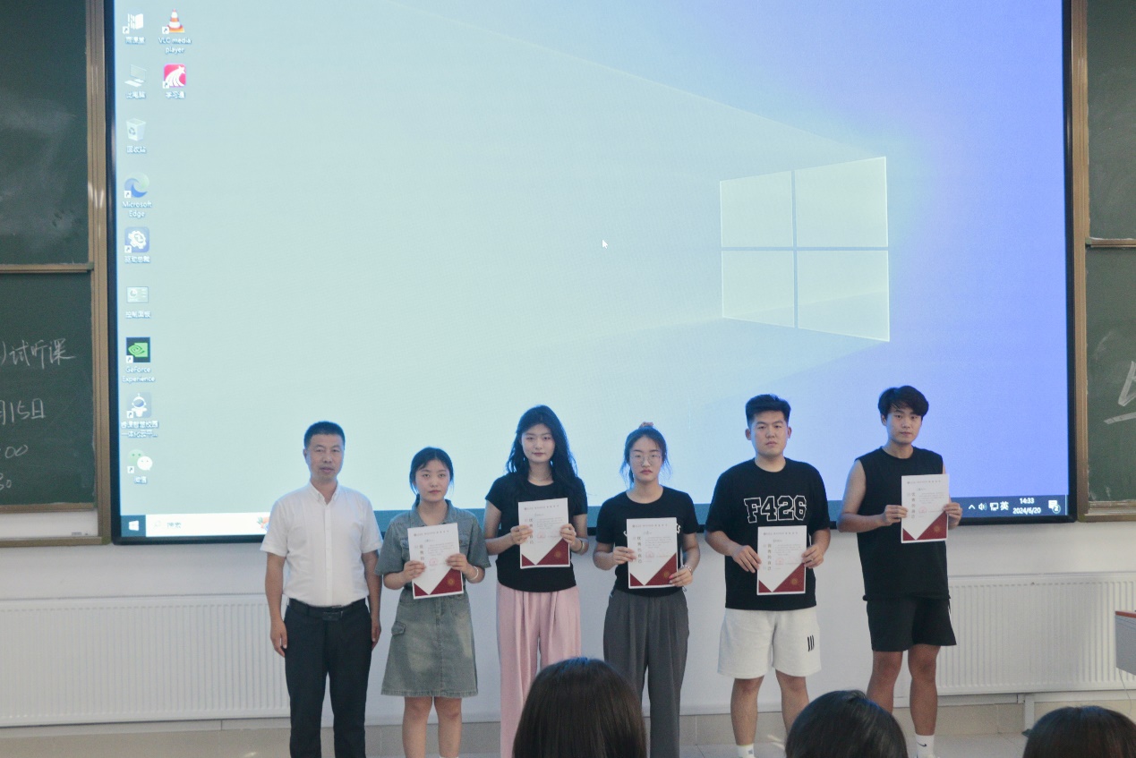 下午2时20分,颁奖典礼开始。杨雯对书法学专业教育教学及此次颁奖典礼情况作了详细介绍。马朝存老师宣读各项优秀作品获奖名单。统战部副部长章亮、美术学院副院长赵平、书法学董汉泽老师和马朝存老师依次为获奖学生颁发证书及奖品并合影留念。最后,副院长赵平进行了总结讲话,并向即将步入大四的学生们送上寄语。