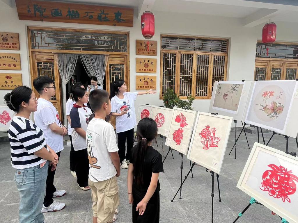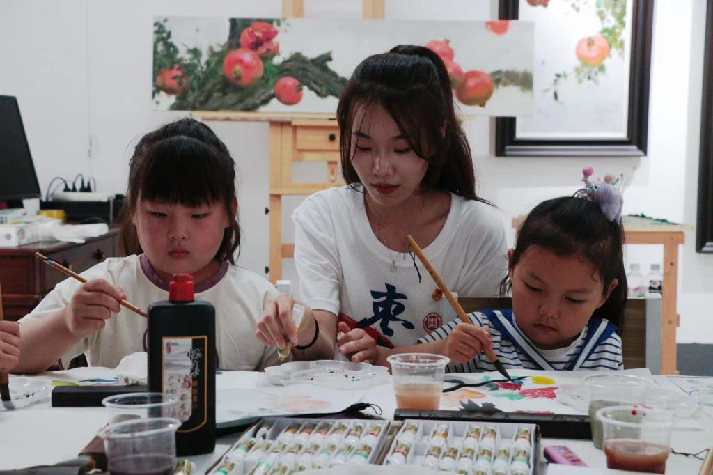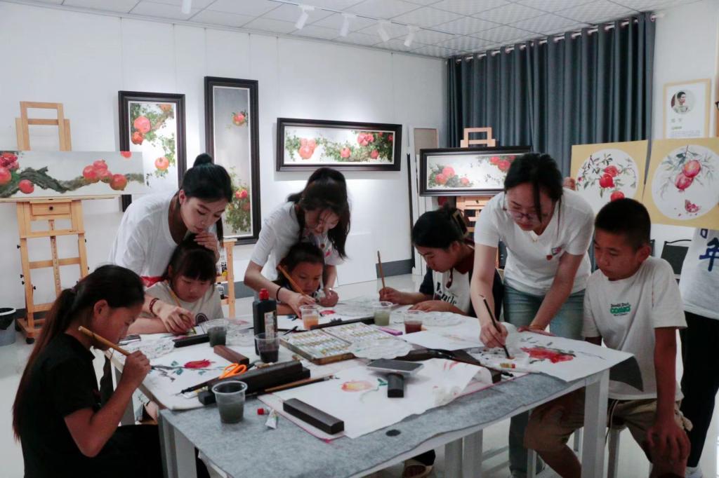 “青绘·艺行”志愿者服务队于枣庄石榴书画院,依托国家级志愿宣讲项目——“中国历代绘画大系”,开展了以石榴为主题的绘画宣讲活动。志愿者为张庄村留守儿童宣讲了中国绘画历史及绘画手法、古画中石榴元素的创作手法等知识。随后,志愿者带领小朋友开展了国画、创意小手工、书法、漆扇diy课堂,带领小朋友们参观了“榴光溢彩满枝头,共画石榴促发展”石榴主题书画展,共展出60余件作品,其中,历代古画复刻作品20件、30件手工作品、10件书法作品,让小朋友们在了解传统文化的同时,也能感受到石榴所承载的美好寓意。