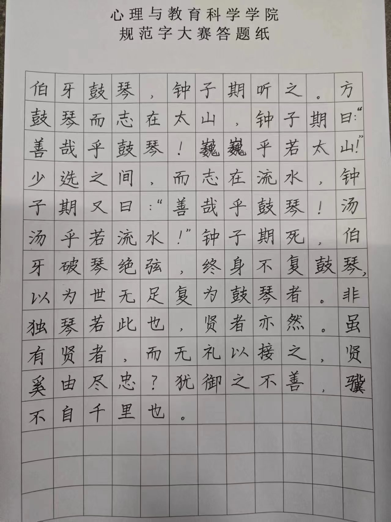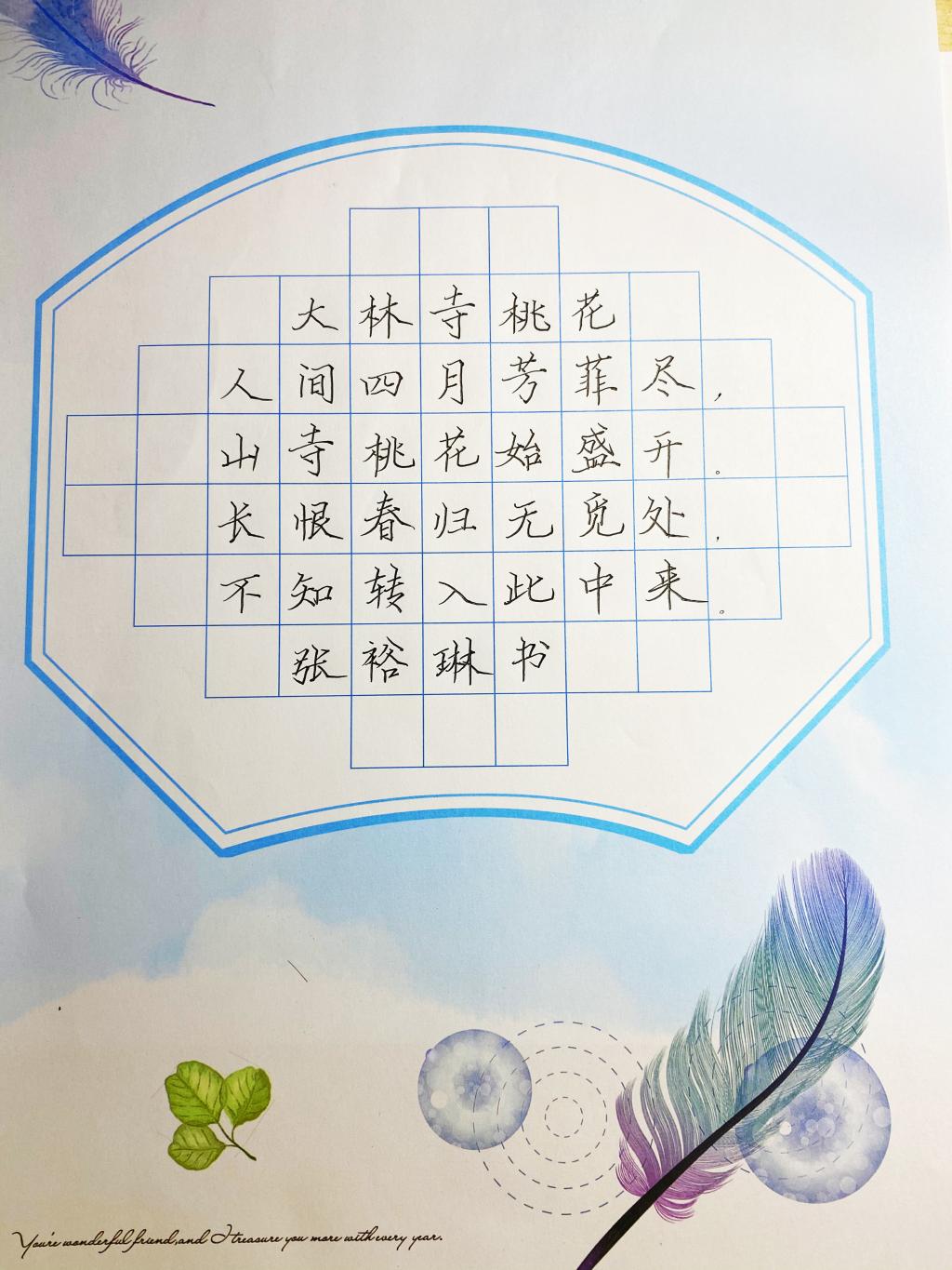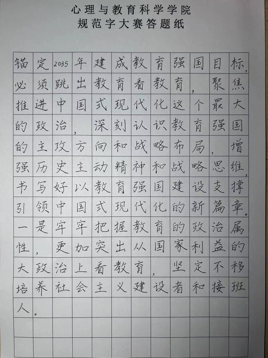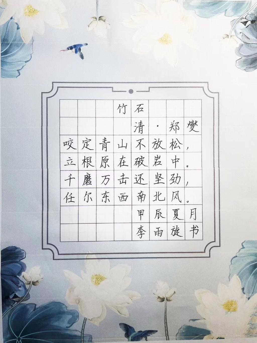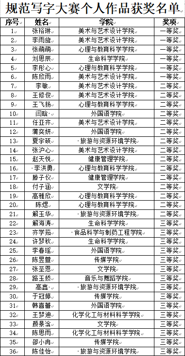 本次活动共有140余名同学参加,大赛分为班级参赛与个人参赛两种形式。大赛从写字坐姿和执笔姿势两方面考察选手的规范写字能力。比赛中,选手们始终秉持严谨的态度,规范坐姿,运笔沉稳,屏息凝神,确保书写的流畅性和稳定性。书写时,下笔刚劲有力,笔画清楚,间架结构合理,每一个笔画、每一个汉字、每一个数字,一笔一划间凝结着选手平日里的勤学苦练。一幅幅作品美观大方,或清秀雅致,或舒展开阔,彰显了选手们良好的书写习惯和深厚的书法功底。本次比赛共收集创作作品140余件,获奖作品有56件,其中一等奖6件,二等奖15件,三等奖20件,优秀奖25件。