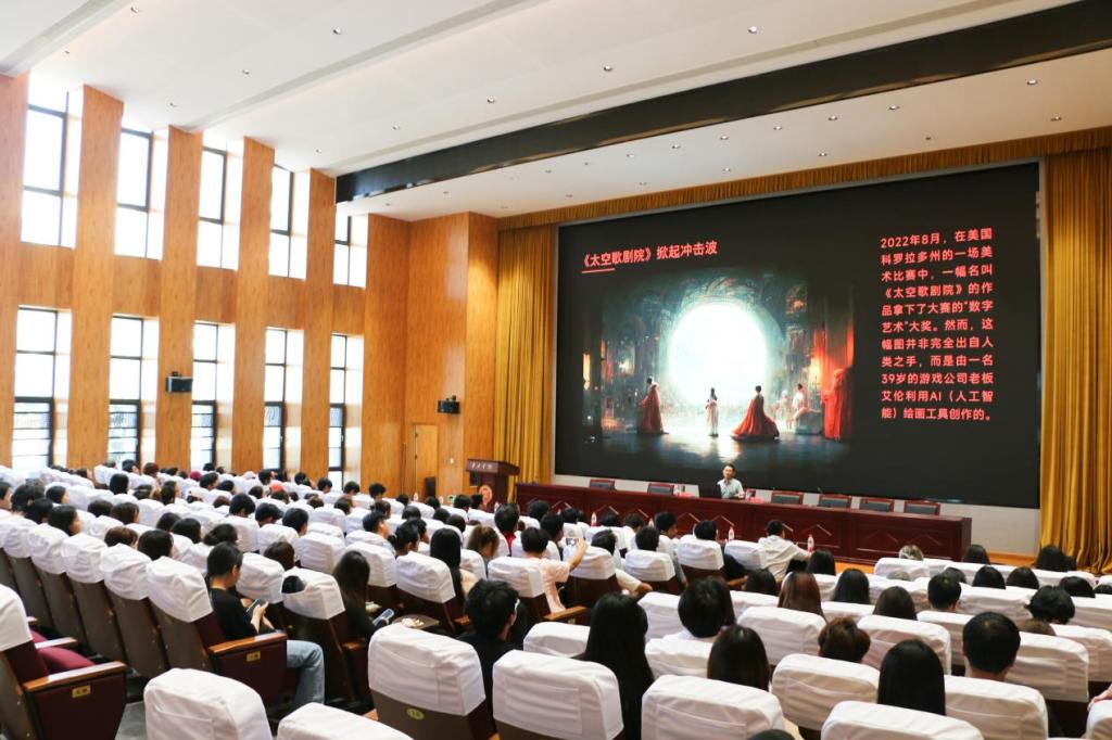 学院党总支书记王剑对张博老师应邀为我校师生作学术报告表示热烈欢迎。会议伊始,张博老师介绍了Midjourney、Stable Diffusion、ChayGYP等人工智能领域的“神器”。张博老师着重讲了人工智能在不同设计领域的应用,并详细举例说明人工智能对不同风格场景的把握、对不同人物形态的把握。在论坛会上,同学们积极举手,就人工智能的相关问题与张博老师进行互动交流。