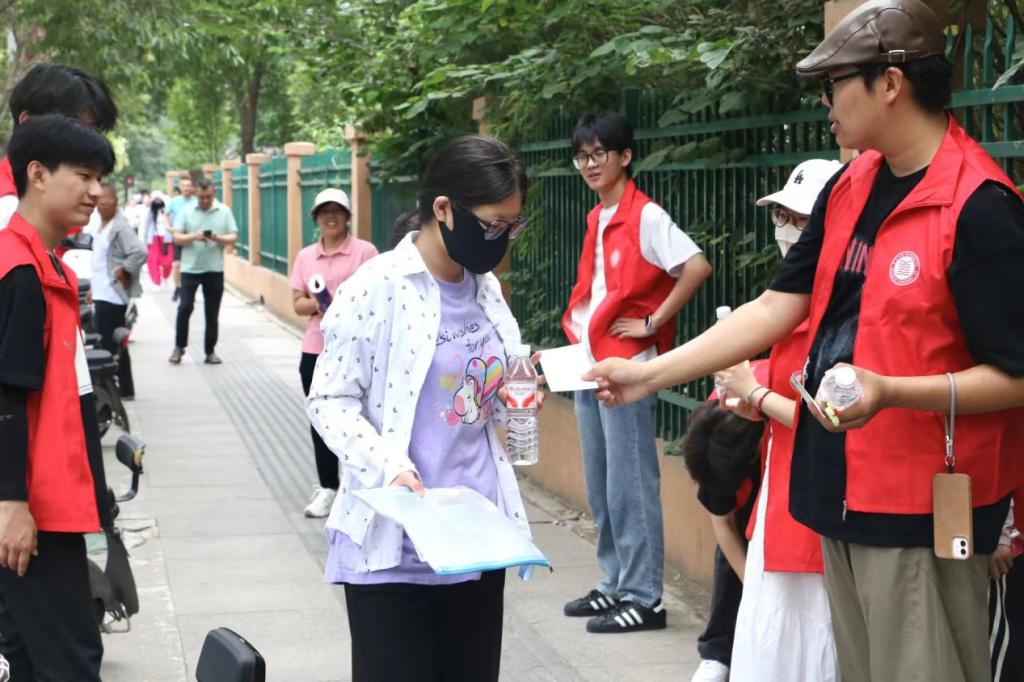 志愿者们在考点外精心布置爱心助考志愿服务点,搭建起遮阳棚、拉起醒目标语横幅、张贴鼓励海报、整齐摆放桌椅,为候考考生与家长打造舒适的纳凉休憩空间。向候考考生与家长免费发放爱心矿泉水、口罩、纸巾等物资,还贴心准备了消暑物品与医疗救助用品,全方位保障考生与家长的需求。志愿者们发挥专业特长,设计高考备考小贴士书签与气球,书签与气球上写着实用的备考建议和鼓励话语,为考生提供贴心指引。