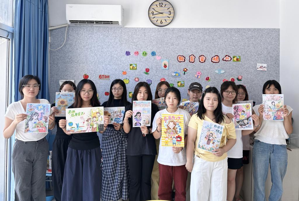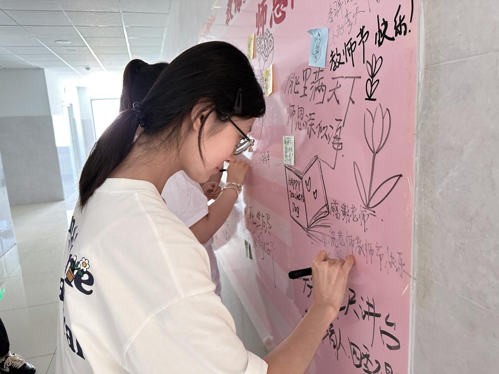 本次活动以“四个一”为主线,在教师节为老师们送上一枝花、一个书签、一张贺卡、一瓶水。同学们将这一份份满载心意的手工礼物送到教师手中,每一件礼品都融合了美院学子的巧思与专业素养,扭扭花象征永不凋谢的师恩,书签上绘有“立德树人,润物无声”等寄语,贺卡则由学生自主设计绘制并手写祝福语,一瓶清泉则寓意恩师润泽心田。温馨感人的教师节,老师们笑容洋溢,倍感欣慰。此外,在9号楼学生一站式社区设有“师恩涂鸦墙”,也吸引了很多同学参与,一句句“老师,您辛苦了”“祝您节日快乐”凝聚成爱的回响。