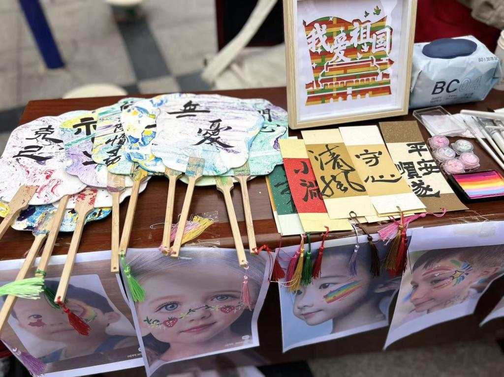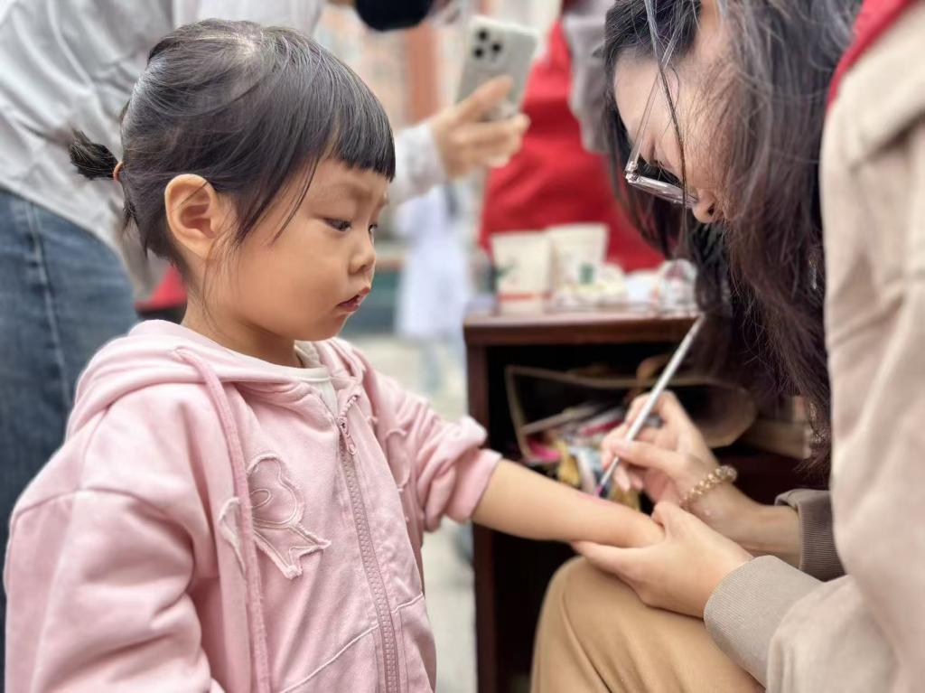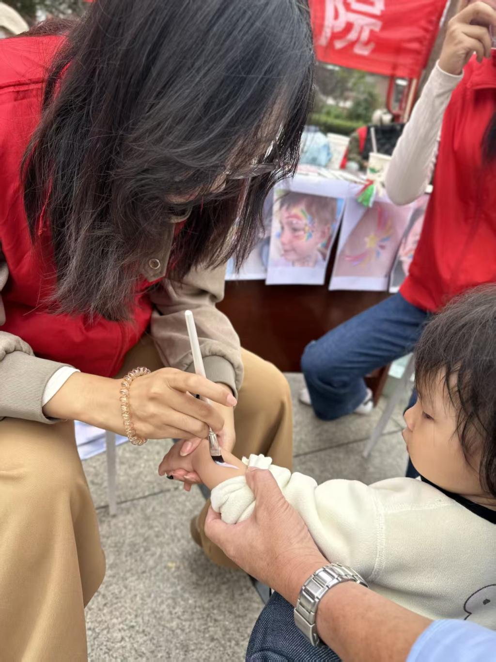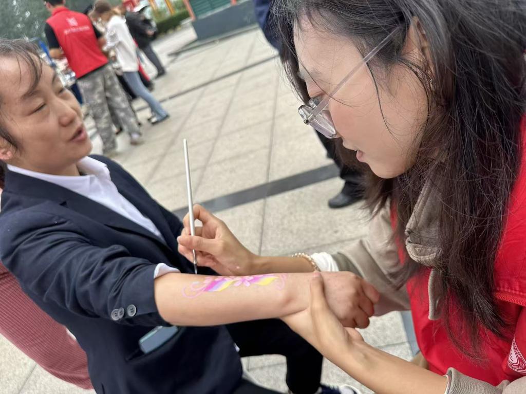 伟德victor1946依托社区创意集市,充分发挥美术与书法专业能写会画的特长,展示了立体纸艺、非遗剪纸、非遗漆扇、水彩画、植物书法文创、竹编画等原创手工作品50件,各类作品兼具艺术性与文化韵味,引得居民驻足观赏。同时,结合中秋、国庆双节将至的节日氛围,为社区群众进行面部和手臂彩绘活动,根据面部特征,用植物颜料,为每个居民和孩子绘制了独一无二的彩绘造型。孩子们看着镜中精致的图案,脸上满是欢喜,纷纷拉着家长拍照留念。此外,现场书写节日祝福书签赠予社区居民,进一步弘扬了中华优秀传统文化,活动现场欢声笑语不断,节日氛围与艺术气息交融。