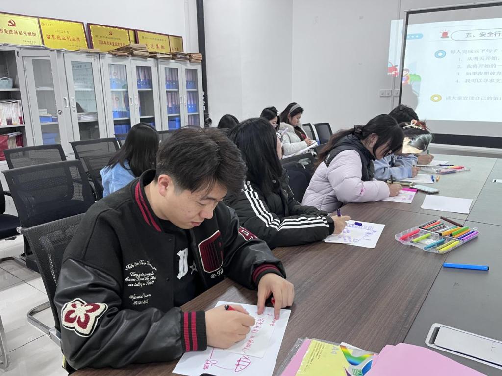 本次活动以交通安全日为契机,组织同学们以团体辅导的形式,沉浸式、互动式的创新形式让交通安全知识更加入脑入心。活动共有9个环节,包括“我们的出行地图”“安全词约定”“时间切片”“侥幸心理温度计”“时光信——给未来自己的承诺”“情景剧场‘一念之间’”“隐形守护者”“安全行为‘微承诺’”“安全能量圈”活动。其中在“我们的出行地图”环节,同学们用彩笔和专属符号绘制昨日出行轨迹,标注步行、骑行等路线及骑行时听歌、看手机等行为,梳理具体的交通安全轨迹;在“时间切片”环节中共同拆解隐形风险;在“安全行为‘微承诺’”卡片上写下对交通安全的感悟与具体行动规划。最后,大家围圈拉手组成“安全能量圈”,分享收获、送上祝福,共同感悟“安全守护者”的责任。