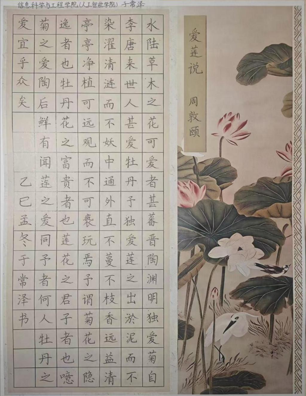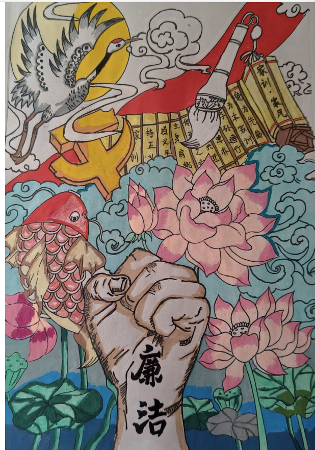 大赛以“以艺弘廉,以美铸魂”为主题,作品形式涵盖书法、绘画、设计,手工制作四个门类,征集的作品内容紧扣廉洁文化核心,将思想性与艺术性统一,要充分展现同学们对清廉价值的深刻理解和独特表达。此次大赛共征集作品300余件,评选出一等奖28名,二等奖67名,三等奖94名。同时,获奖作品中选取40件优秀作品于莲花餐厅东侧进行展览,同学们驻足观赏、交流感悟,实现了 “观艺品廉、以美润心” 的活动初衷。