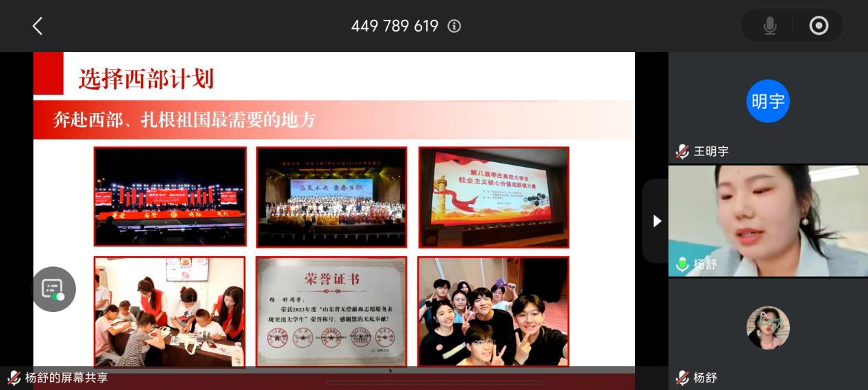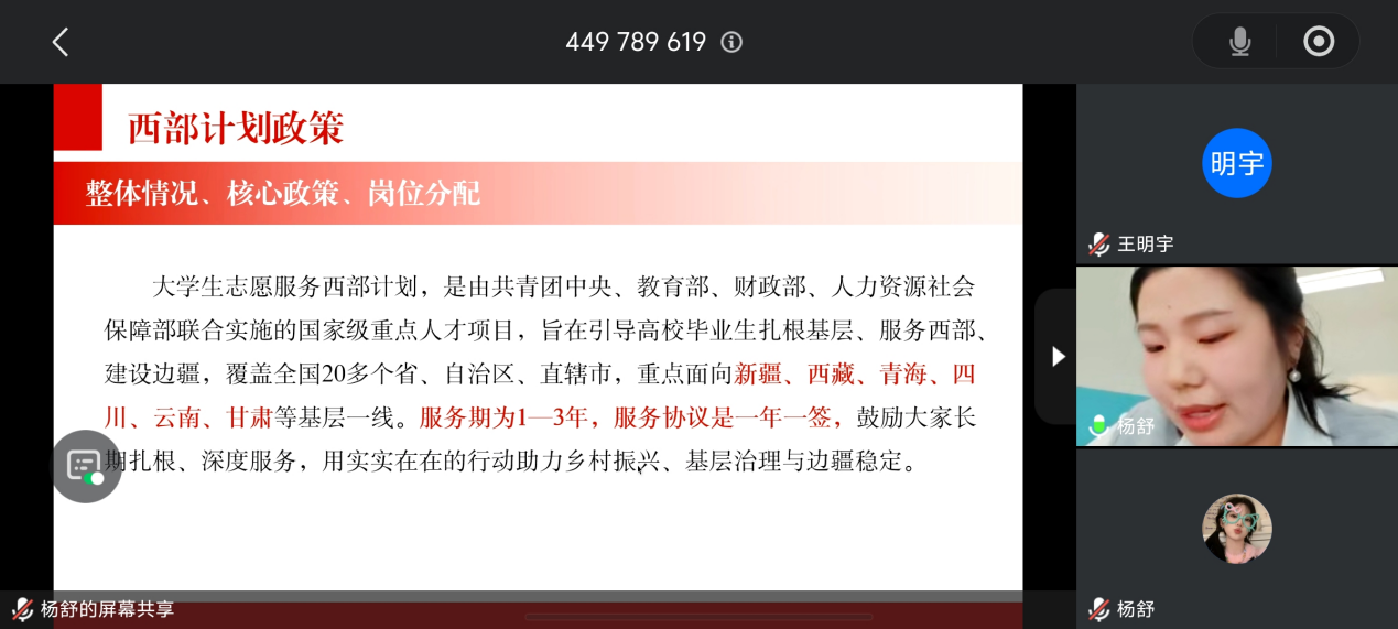 此次宣讲会线上线下同时进行,邀请伟德victor1946优秀毕业生杨舒为在校同学们进行宣讲。宣讲会上她结合亲身志愿服务经历分享感悟,系统介绍了西部计划项目概况,细致解读了相关政策与岗位分类,详细讲解了报名的流程方法、选拔流程及时间节点等。重点讲解了西部计划相关待遇保障与期满考研、考公、就业等优惠政策。同时,进行了现场的互动交流和问答,她耐心回应同学们提出的问题。最后,西部计划工作负责老师对宣讲进行总结,鼓励毕业生胸怀家国、扎根基层,将专业所长与社会需求相结合,以实际行动投身西部建设,在服务奉献中实现青春价值。