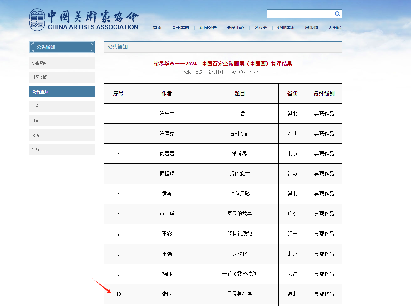 10月17日,由中国美术家协会、中共江苏省委宣传部、江苏省文化和旅游厅、江苏省文学艺术界联合会共同办的“翰墨华章——2024·中国百家金陵画展(中国画)”复评结果公布,我张闻老师的参展作品《雪霁柳汀岸》被评为“典藏作品”。