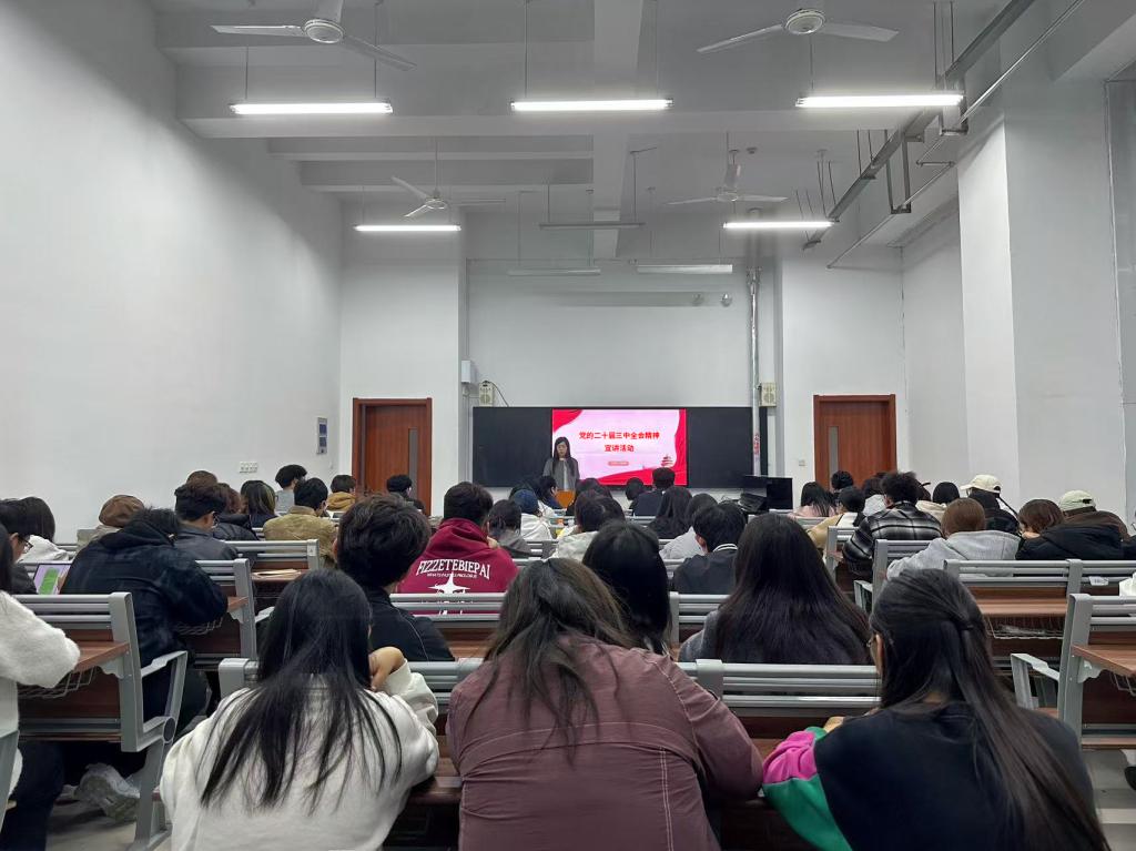 高翠萍从从深刻认识党的二十届三中全会的重大意义、深刻把握习近平总书记在党的二十届三中全会上的重要讲话精神、全面准确理解《中共中央关于进一步全面深化改革、推进中国式现代化的决定》中关于教育、科技、人才的重要论述等方面,对党的二十届三中全会作了全面宣讲和深入阐宣讲结束后,同学们纷纷表示对党的二十届三中全会议精神有了更深刻的理解和认识,并且发出“我们作为新时代青年将会坚定理想信念,敢于挺膺担当,在推进强国建设、民族复兴伟业中展现青春作为、彰显青春风采、贡献青春力量,奋力书写为中国式现代化挺膺担当的青春篇章”青春强音!