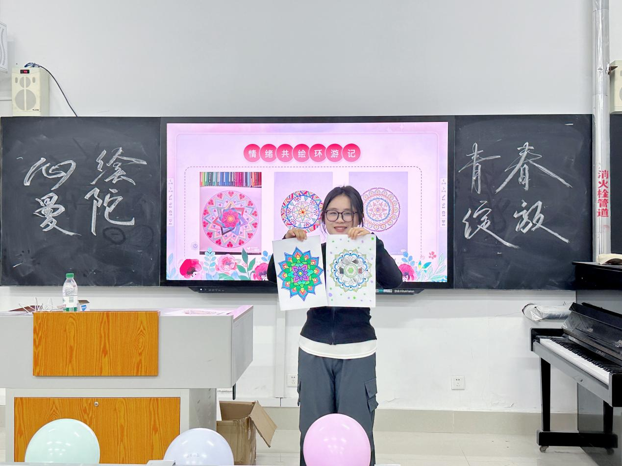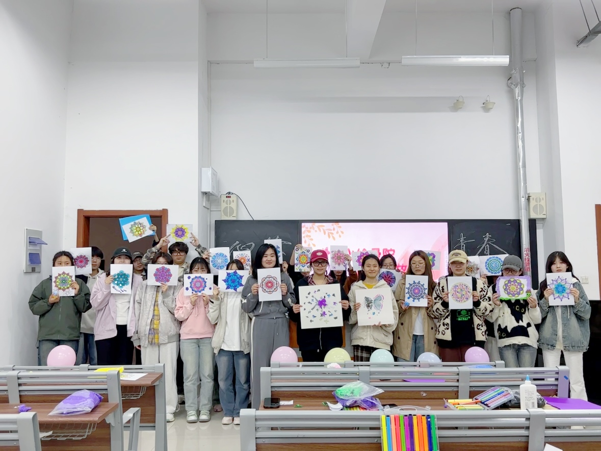 活动开始,主讲人对大学生心理健康现状展开了深入剖析,详细介绍了曼陀罗的起源、文化背景、艺术疗愈原理以及相关成功疗愈案例,让同学们探索自己的内心世界,释放负面情绪,提升自我觉察与自我疗愈能力。随后,通过“神秘盲盒猜猜绘”“情绪共绘环游记”“双材拼图二重奏”“听歌‘识’图”四个游戏环节,同学们将情绪释放和转换,用色彩和图案倾诉心声,用心灵感受艺术的疗愈力量。本次活动共创作作品30余幅,互动环节,同学们分享自己作品背后的含义,增进了彼此的了解,营造出温暖、和谐的氛围。