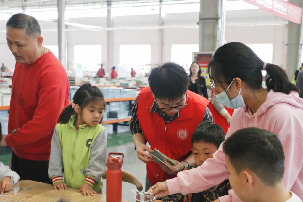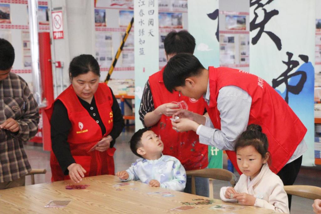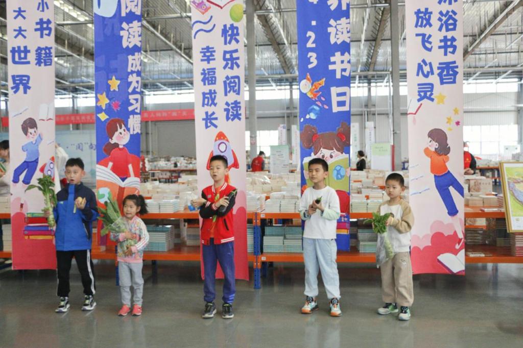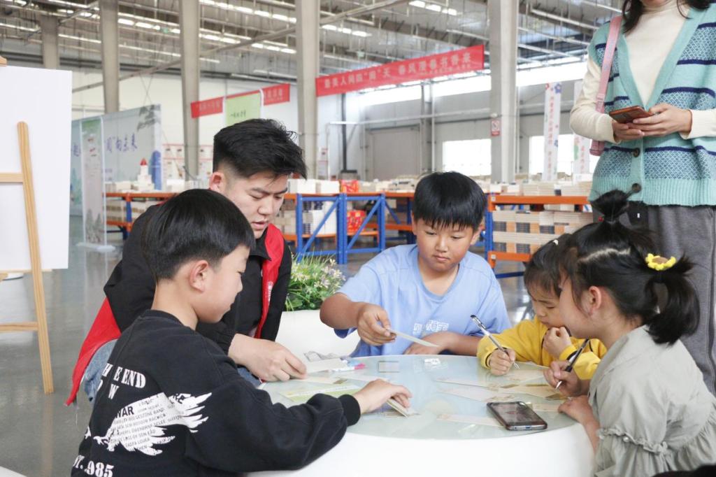 活动伊始,小朋友们在入场处有序排队签到,通过背诵诗词领取书籍。本次活动分为流书局-儿童跳蚤市集、以书换蔬、民族故事阅读盲盒、创意书签设计、垃圾分类体验、拼贴诗、赠子春天、与书相约、我与书籍合个影九部分,小朋友们在志愿者们的带领下依次参加活动。活动现场热闹非凡,小朋友们通过一书换一书,旧书换新友,以书换蔬,给市集带来鲜活温度,将书籍的文化精神传递给每一位参与者。