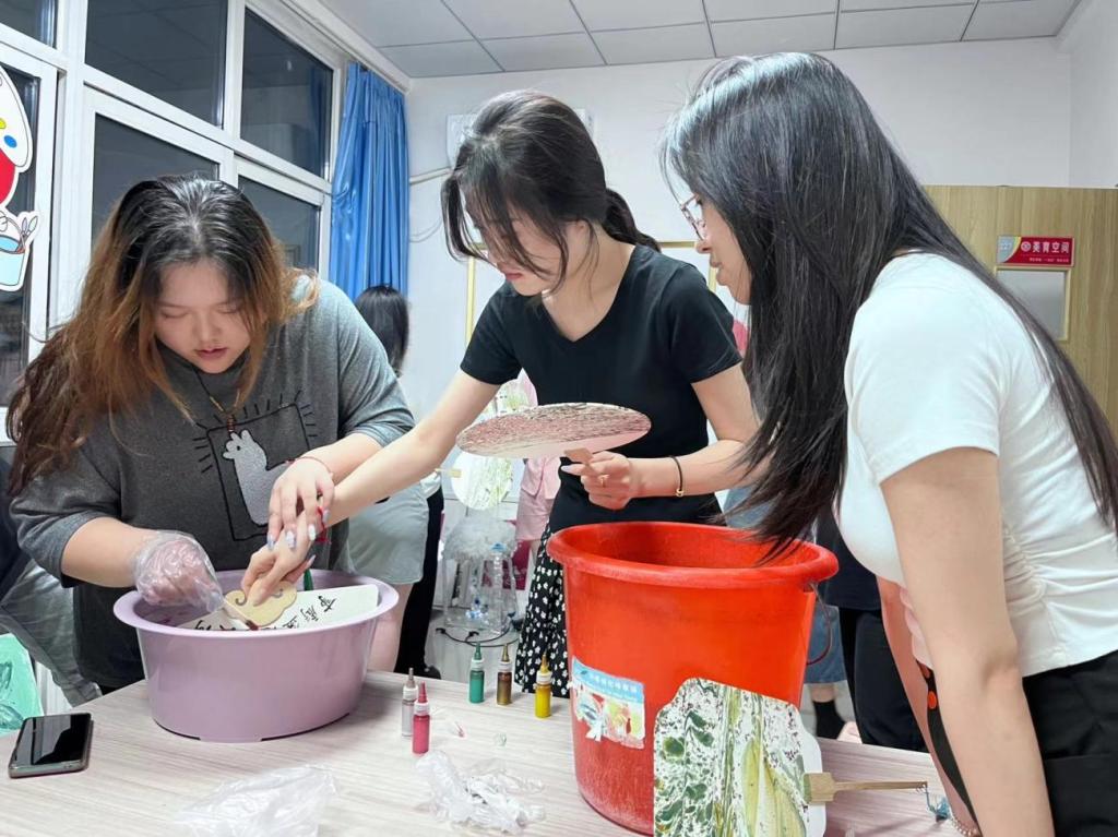 活动开始,主持人介绍了小满节气的习俗,漆扇的历史渊源、技艺特点和文化内涵等,重点讲解了漆扇的制作步骤和技巧,并带领学生观看了短视频。随后,学生以小组为单位,分工合作,以漆作画,以扇为纸,充分发挥自己的想象力和创造力,滴漆、调漆、拨纹,将团扇缓缓放入漆桶,通过旋转让颜色浸入到扇子上形成绚丽多彩的图案。经过一番专注创作,一把把独一无二的漆扇作品跃然眼前。